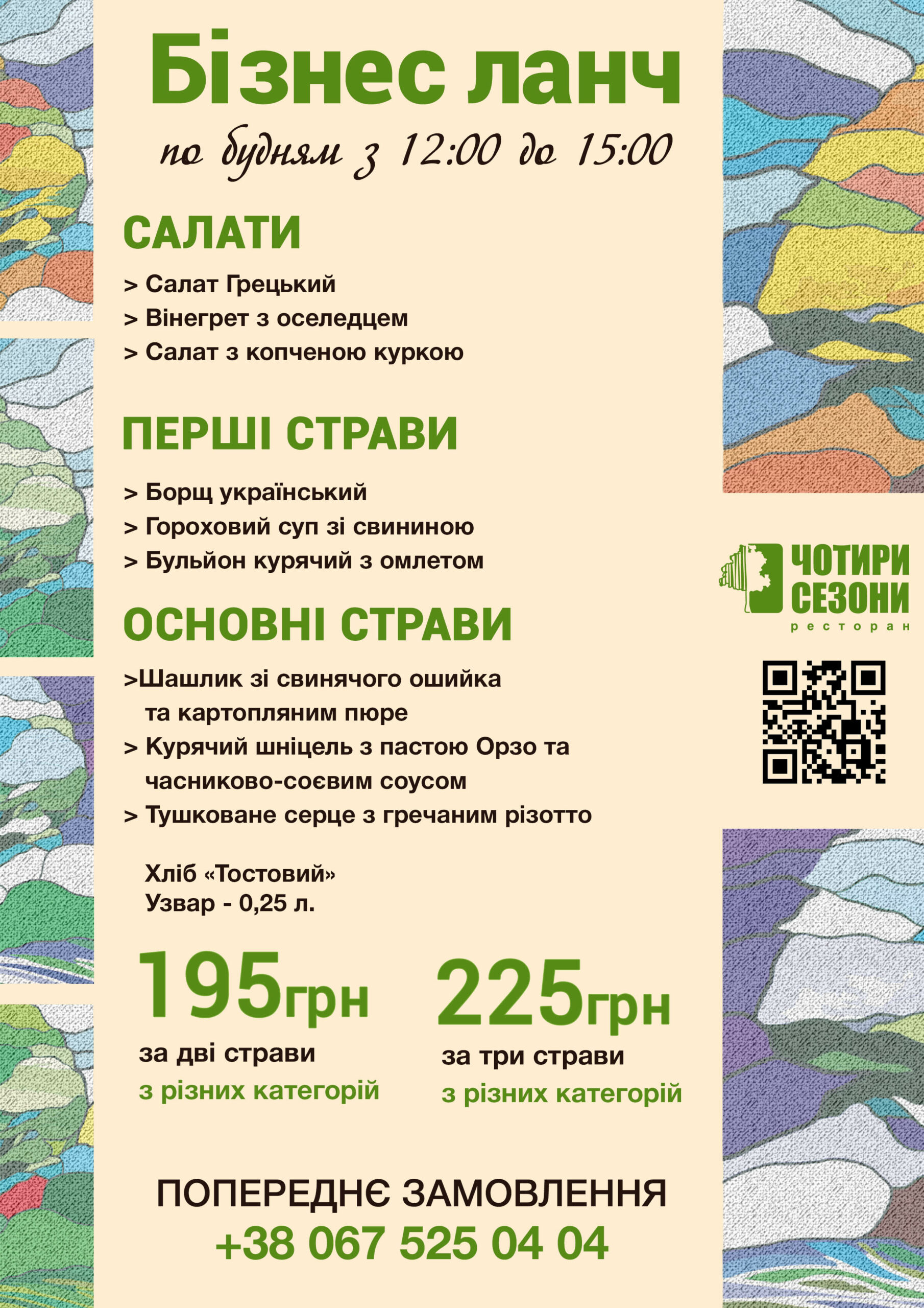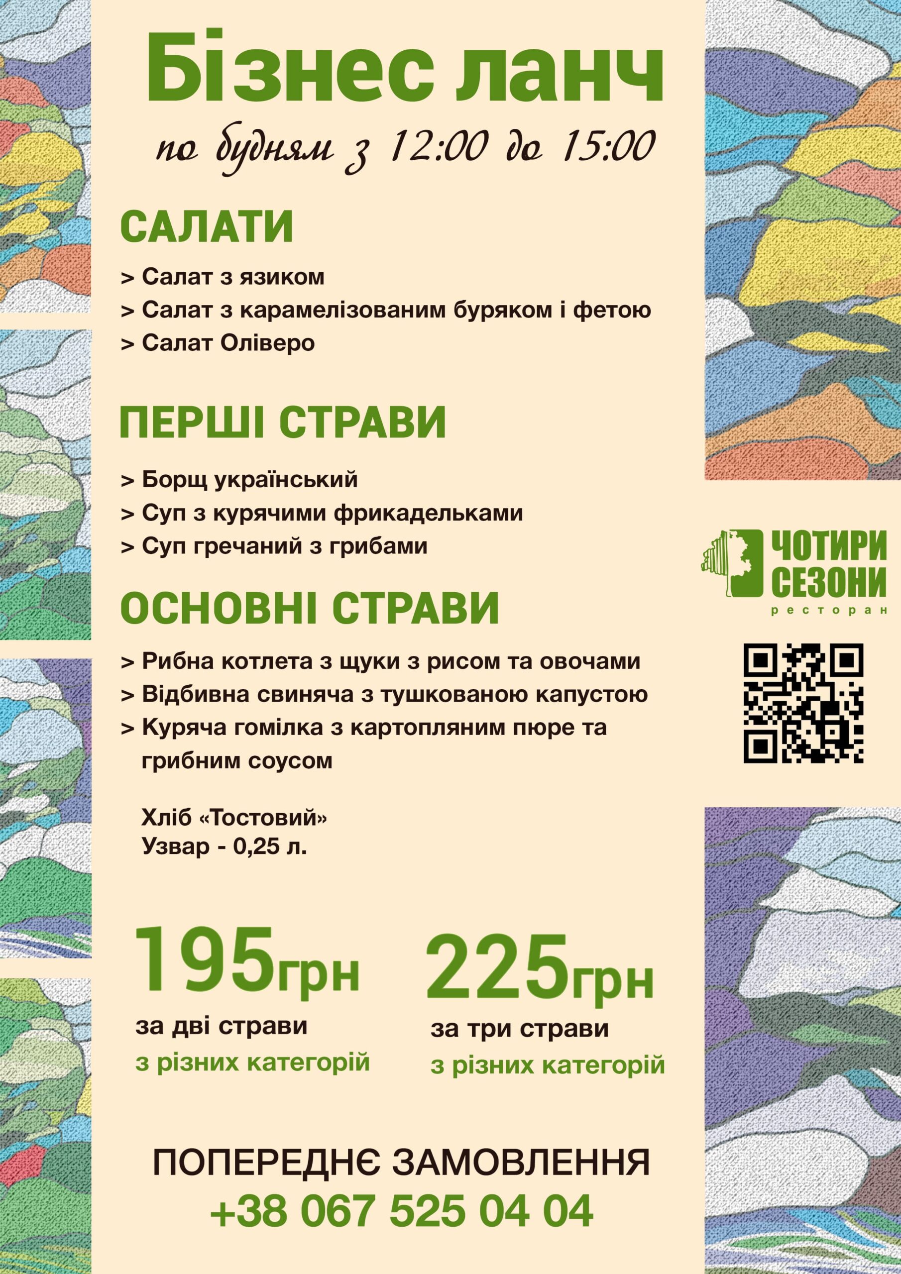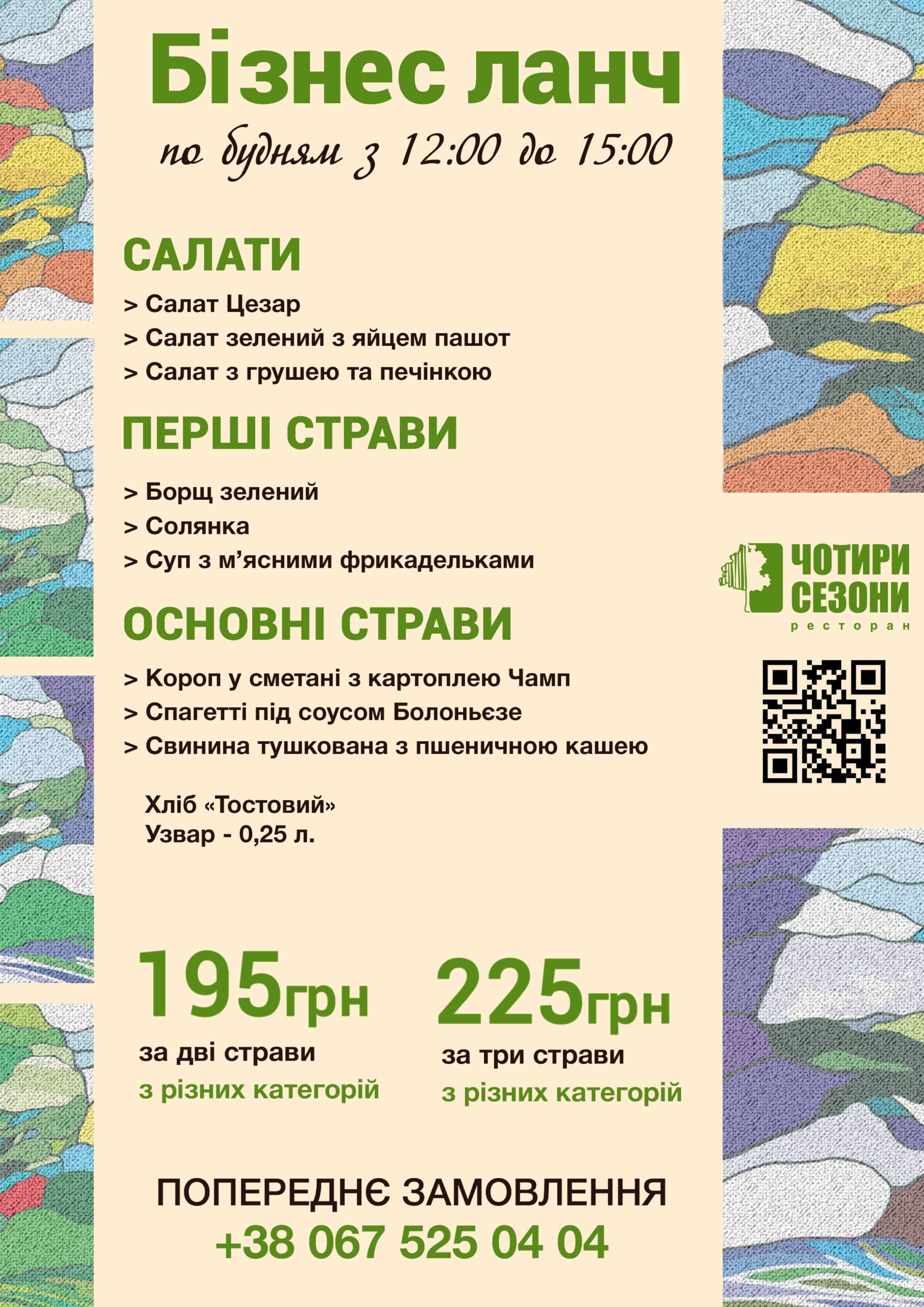 Світлий і просторий зал, різноманітність смачних страв європейської та авторської кухні, якісні продукти і чудовий сервіс. Ми гарантуємо високу якість, так як уважно стежимо і вибираємо тільки найкращі продукти для приготування смачних страв.