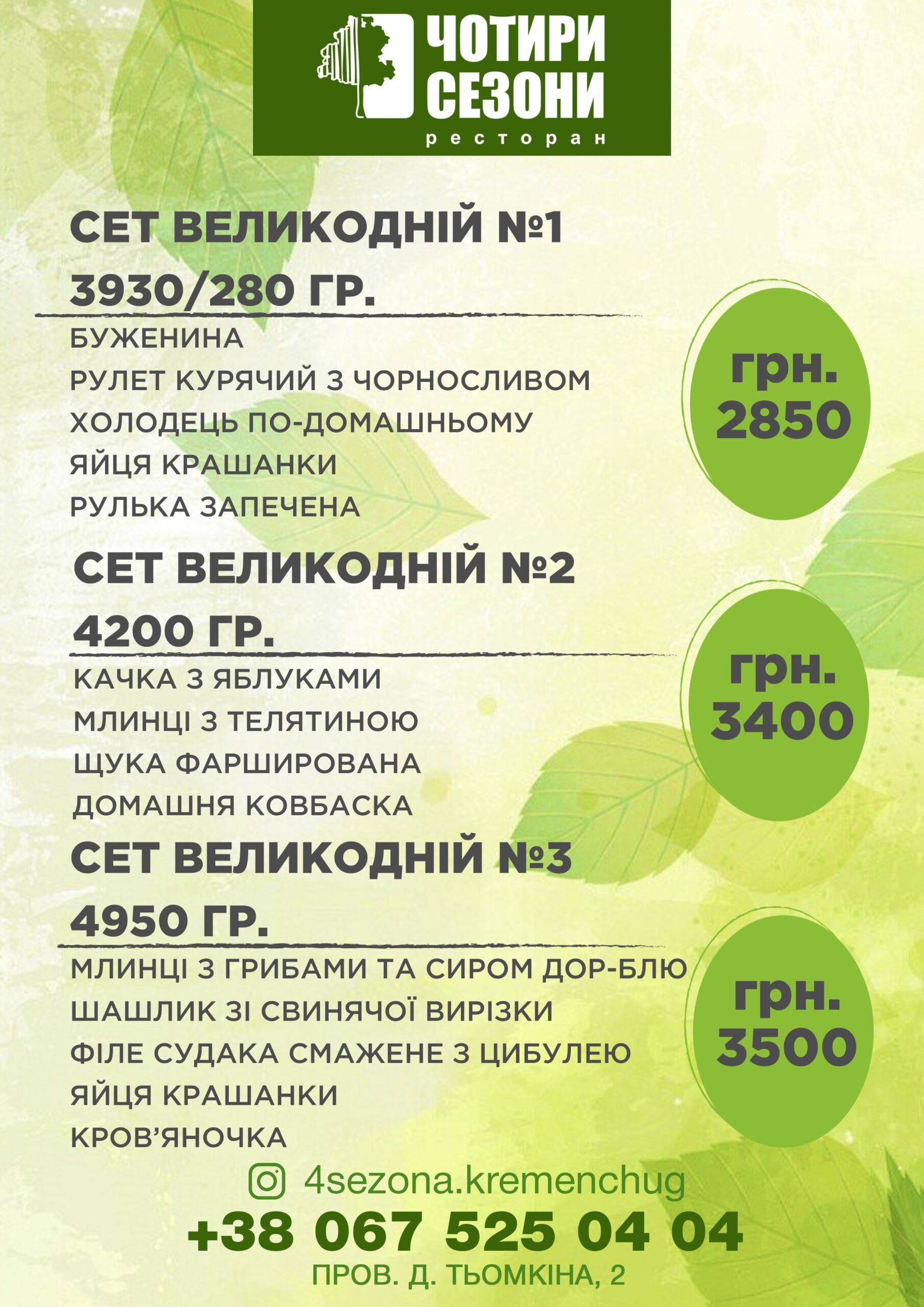 Літній майданчик ресторану “4 сезони” розташований на набережній міста Кременчука. Тераса наповнена квітами і сяє безліччю вогнів у вечірній час. У вихідні атмосферу відпочинку в закладі створює жива музика.